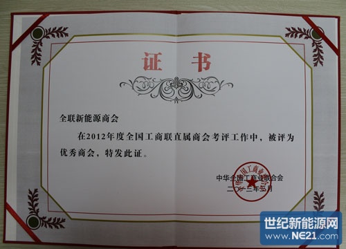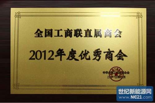 全聯新能源商會榮獲【全國工商聯2012年度優秀商會】